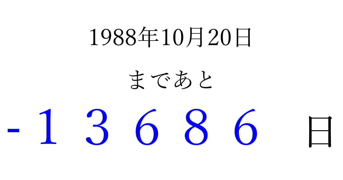 1988年10月20日(木)は もう 00000 日過ぎました 追加すると、トップページからすぐ選べるようになります ※2026/04/10現在の結果です。 最新の状態に更新する ↓シェアして、タイムライン上にカウントダウンを表示しよう!↓ 📤 この結果を共有する Tweet シェア Threads Bluesky 別の日付でカウントダウン 1988年10月のカレンダー このページをブックマークに追加すると、いつでもカウントダウンを確認できます。 (PC: Ctrl+D / Mac: ⌘+D) hitome-notes.comでは以下のページも運営しています。 指定日と期間から日付を計算 | ガチャ確率計算・シミュレーション | プライバシー・ポリシー 運営者:Avocado