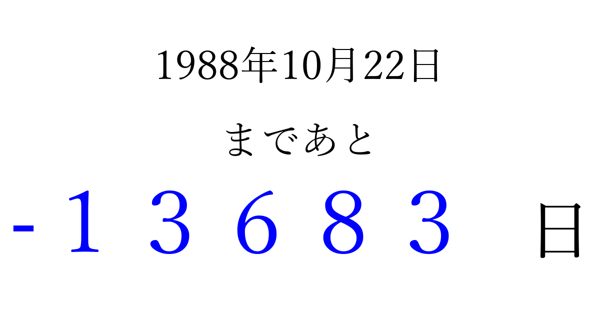 1988年10月22日(土)は もう 00000 日過ぎました 追加すると、トップページからすぐ選べるようになります ※2026/04/09現在の結果です。 最新の状態に更新する ↓シェアして、タイムライン上にカウントダウンを表示しよう!↓ 📤 この結果を共有する Tweet シェア Threads Bluesky 別の日付でカウントダウン 1988年10月のカレンダー このページをブックマークに追加すると、いつでもカウントダウンを確認できます。 (PC: Ctrl+D / Mac: ⌘+D) hitome-notes.comでは以下のページも運営しています。 指定日と期間から日付を計算 | ガチャ確率計算・シミュレーション | プライバシー・ポリシー 運営者:Avocado