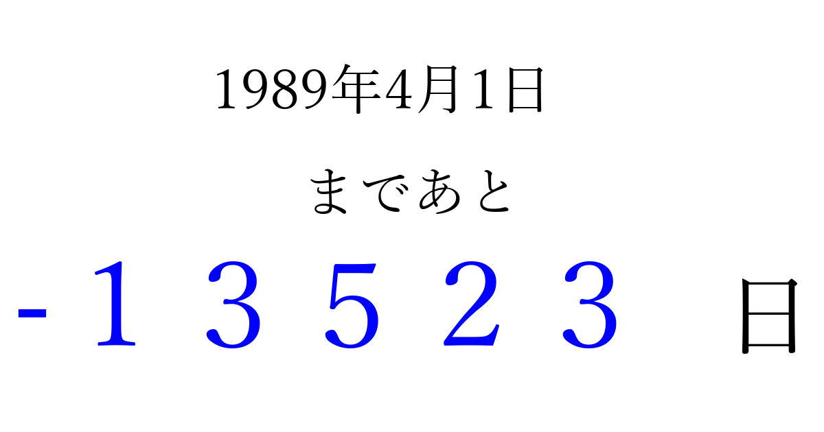 1989年4月1日(土)は もう 00000 日過ぎました 追加すると、トップページからすぐ選べるようになります ※2026/04/10現在の結果です。 最新の状態に更新する ↓シェアして、タイムライン上にカウントダウンを表示しよう!↓ 📤 この結果を共有する Tweet シェア Threads Bluesky 別の日付でカウントダウン 1989年4月のカレンダー このページをブックマークに追加すると、いつでもカウントダウンを確認できます。 (PC: Ctrl+D / Mac: ⌘+D) hitome-notes.comでは以下のページも運営しています。 指定日と期間から日付を計算 | ガチャ確率計算・シミュレーション | プライバシー・ポリシー 運営者:Avocado