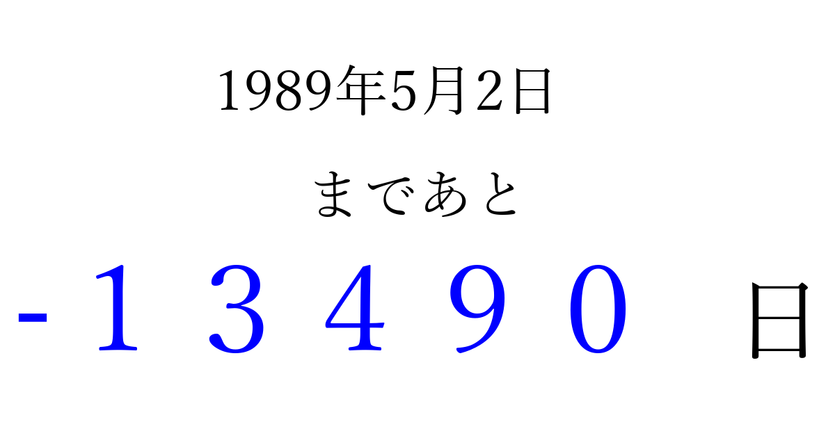 1989年5月2日(火)は もう 00000 日過ぎました 追加すると、トップページからすぐ選べるようになります ※2026/04/08現在の結果です。 最新の状態に更新する ↓シェアして、タイムライン上にカウントダウンを表示しよう!↓ 📤 この結果を共有する Tweet シェア Threads Bluesky 別の日付でカウントダウン 1989年5月のカレンダー このページをブックマークに追加すると、いつでもカウントダウンを確認できます。 (PC: Ctrl+D / Mac: ⌘+D) hitome-notes.comでは以下のページも運営しています。 指定日と期間から日付を計算 | ガチャ確率計算・シミュレーション | プライバシー・ポリシー 運営者:Avocado