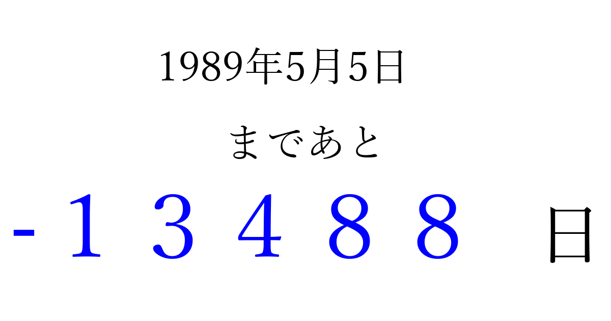 1989年5月5日(金)は もう 00000 日過ぎました 追加すると、トップページからすぐ選べるようになります ※2026/04/09現在の結果です。 最新の状態に更新する ↓シェアして、タイムライン上にカウントダウンを表示しよう!↓ 📤 この結果を共有する Tweet シェア Threads Bluesky 別の日付でカウントダウン 1989年5月のカレンダー このページをブックマークに追加すると、いつでもカウントダウンを確認できます。 (PC: Ctrl+D / Mac: ⌘+D) hitome-notes.comでは以下のページも運営しています。 指定日と期間から日付を計算 | ガチャ確率計算・シミュレーション | プライバシー・ポリシー 運営者:Avocado