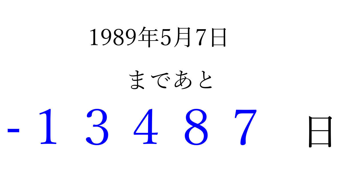 1989年5月7日(日)は もう 00000 日過ぎました 追加すると、トップページからすぐ選べるようになります ※2026/04/10現在の結果です。 最新の状態に更新する ↓シェアして、タイムライン上にカウントダウンを表示しよう!↓ 📤 この結果を共有する Tweet シェア Threads Bluesky 別の日付でカウントダウン 1989年5月のカレンダー このページをブックマークに追加すると、いつでもカウントダウンを確認できます。 (PC: Ctrl+D / Mac: ⌘+D) hitome-notes.comでは以下のページも運営しています。 指定日と期間から日付を計算 | ガチャ確率計算・シミュレーション | プライバシー・ポリシー 運営者:Avocado