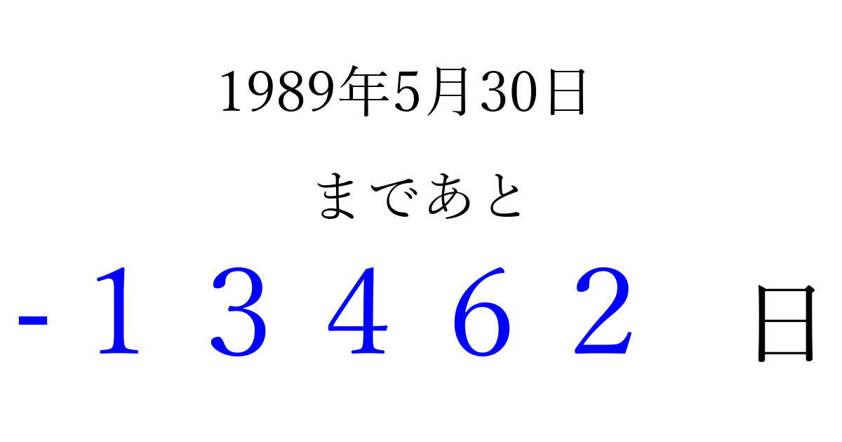 1989年5月30日(火)は もう 00000 日過ぎました 追加すると、トップページからすぐ選べるようになります ※2026/04/08現在の結果です。 最新の状態に更新する ↓シェアして、タイムライン上にカウントダウンを表示しよう!↓ 📤 この結果を共有する Tweet シェア Threads Bluesky 別の日付でカウントダウン 1989年5月のカレンダー このページをブックマークに追加すると、いつでもカウントダウンを確認できます。 (PC: Ctrl+D / Mac: ⌘+D) hitome-notes.comでは以下のページも運営しています。 指定日と期間から日付を計算 | ガチャ確率計算・シミュレーション | プライバシー・ポリシー 運営者:Avocado