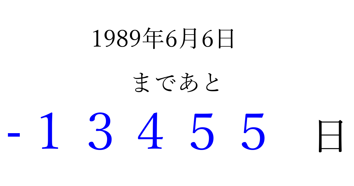 1989年6月6日(火)は もう 00000 日過ぎました 追加すると、トップページからすぐ選べるようになります ※2026/04/08現在の結果です。 最新の状態に更新する ↓シェアして、タイムライン上にカウントダウンを表示しよう!↓ 📤 この結果を共有する Tweet シェア Threads Bluesky 別の日付でカウントダウン 1989年6月のカレンダー このページをブックマークに追加すると、いつでもカウントダウンを確認できます。 (PC: Ctrl+D / Mac: ⌘+D) hitome-notes.comでは以下のページも運営しています。 指定日と期間から日付を計算 | ガチャ確率計算・シミュレーション | プライバシー・ポリシー 運営者:Avocado