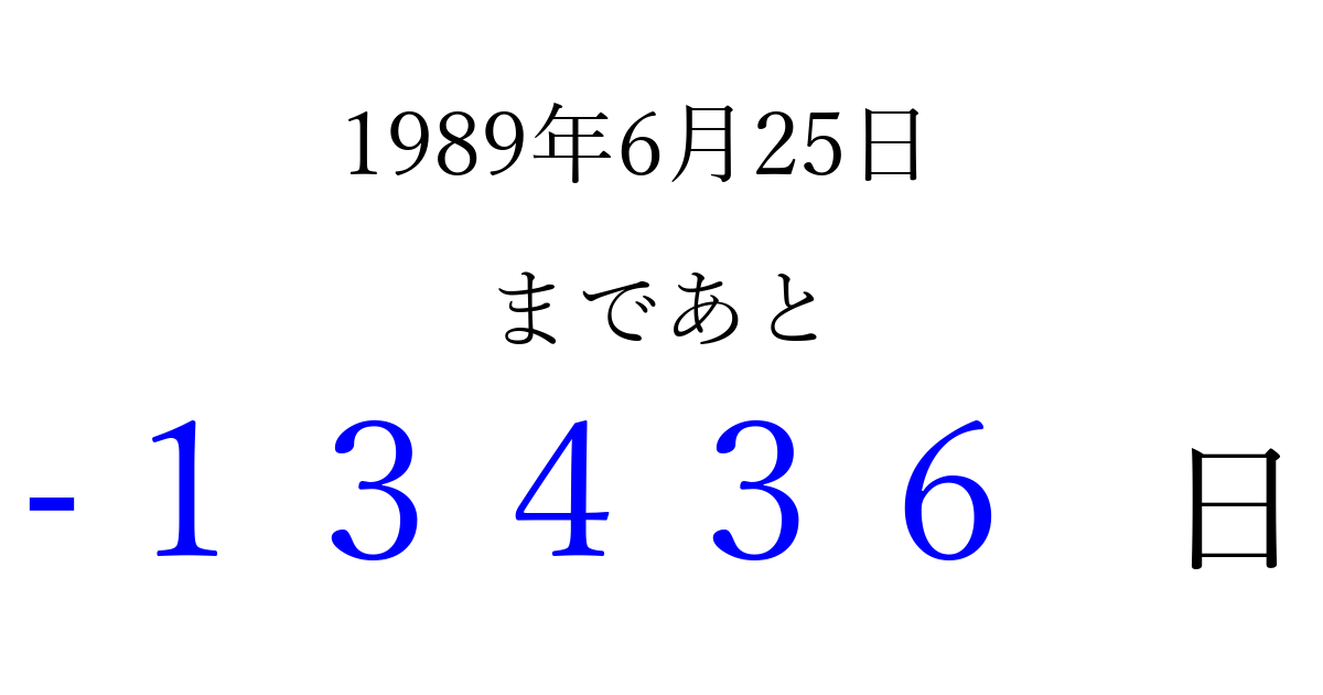 1989年6月25日(日)は もう 00000 日過ぎました 追加すると、トップページからすぐ選べるようになります ※2026/04/08現在の結果です。 最新の状態に更新する ↓シェアして、タイムライン上にカウントダウンを表示しよう!↓ 📤 この結果を共有する Tweet シェア Threads Bluesky 別の日付でカウントダウン 1989年6月のカレンダー このページをブックマークに追加すると、いつでもカウントダウンを確認できます。 (PC: Ctrl+D / Mac: ⌘+D) hitome-notes.comでは以下のページも運営しています。 指定日と期間から日付を計算 | ガチャ確率計算・シミュレーション | プライバシー・ポリシー 運営者:Avocado