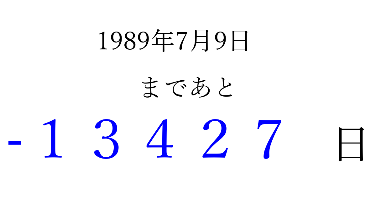1989年7月9日(日)は もう 00000 日過ぎました 追加すると、トップページからすぐ選べるようになります ※2026/04/13現在の結果です。 最新の状態に更新する ↓シェアして、タイムライン上にカウントダウンを表示しよう!↓ 📤 この結果を共有する Tweet シェア Threads Bluesky 別の日付でカウントダウン 1989年7月のカレンダー このページをブックマークに追加すると、いつでもカウントダウンを確認できます。 (PC: Ctrl+D / Mac: ⌘+D) hitome-notes.comでは以下のページも運営しています。 指定日と期間から日付を計算 | ガチャ確率計算・シミュレーション | プライバシー・ポリシー 運営者:Avocado