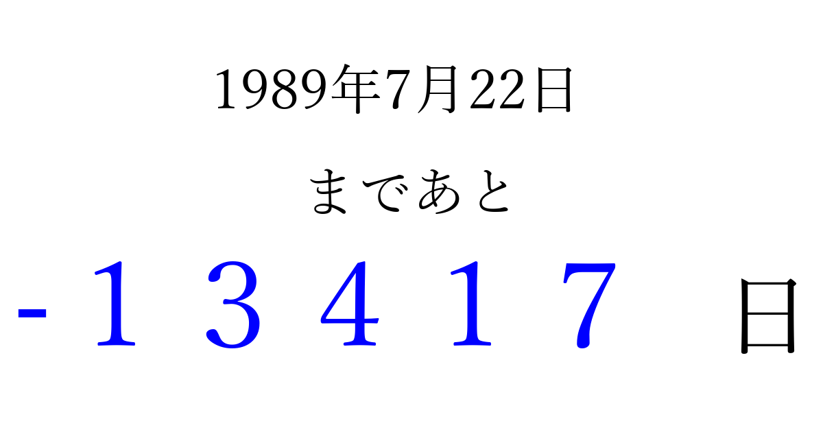 1989年7月22日(土)は もう 00000 日過ぎました 追加すると、トップページからすぐ選べるようになります ※2026/04/16現在の結果です。 最新の状態に更新する ↓シェアして、タイムライン上にカウントダウンを表示しよう!↓ 📤 この結果を共有する Tweet シェア Threads Bluesky 別の日付でカウントダウン 1989年7月のカレンダー このページをブックマークに追加すると、いつでもカウントダウンを確認できます。 (PC: Ctrl+D / Mac: ⌘+D) hitome-notes.comでは以下のページも運営しています。 指定日と期間から日付を計算 | ガチャ確率計算・シミュレーション | プライバシー・ポリシー 運営者:Avocado