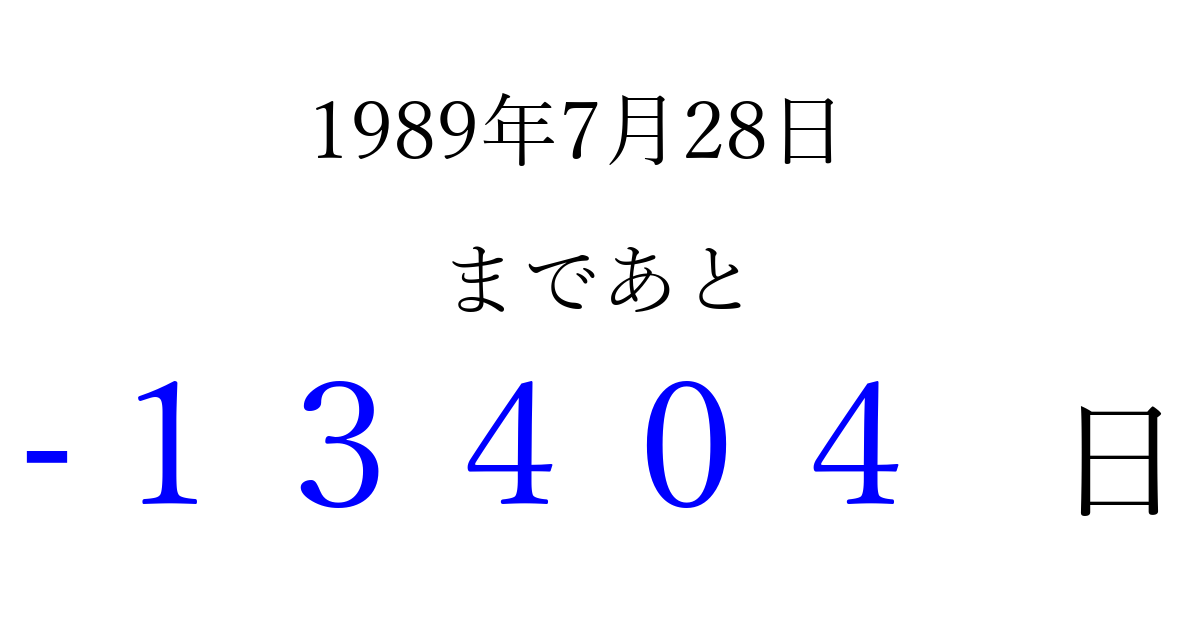 1989年7月28日(金)は もう 00000 日過ぎました 追加すると、トップページからすぐ選べるようになります ※2026/04/09現在の結果です。 最新の状態に更新する ↓シェアして、タイムライン上にカウントダウンを表示しよう!↓ 📤 この結果を共有する Tweet シェア Threads Bluesky 別の日付でカウントダウン 1989年7月のカレンダー このページをブックマークに追加すると、いつでもカウントダウンを確認できます。 (PC: Ctrl+D / Mac: ⌘+D) hitome-notes.comでは以下のページも運営しています。 指定日と期間から日付を計算 | ガチャ確率計算・シミュレーション | プライバシー・ポリシー 運営者:Avocado
