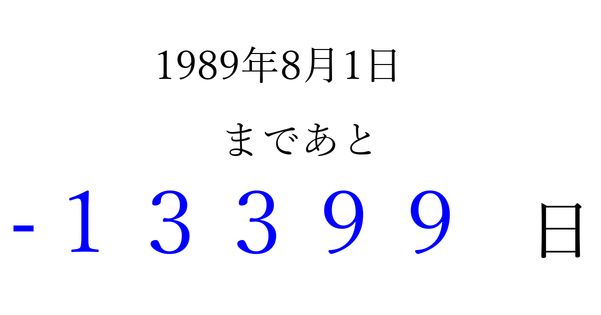 1989年8月1日(火)は もう 00000 日過ぎました 追加すると、トップページからすぐ選べるようになります ※2026/04/08現在の結果です。 最新の状態に更新する ↓シェアして、タイムライン上にカウントダウンを表示しよう!↓ 📤 この結果を共有する Tweet シェア Threads Bluesky 別の日付でカウントダウン 1989年8月のカレンダー このページをブックマークに追加すると、いつでもカウントダウンを確認できます。 (PC: Ctrl+D / Mac: ⌘+D) hitome-notes.comでは以下のページも運営しています。 指定日と期間から日付を計算 | ガチャ確率計算・シミュレーション | プライバシー・ポリシー 運営者:Avocado