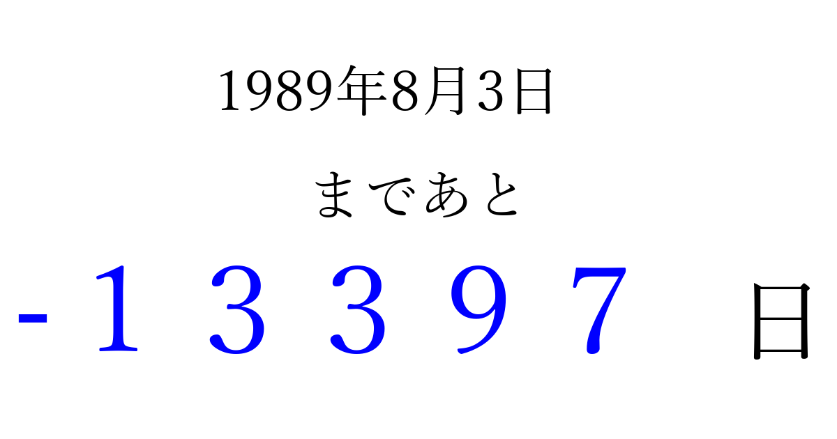 1989年8月3日(木)は もう 00000 日過ぎました 追加すると、トップページからすぐ選べるようになります ※2026/04/08現在の結果です。 最新の状態に更新する ↓シェアして、タイムライン上にカウントダウンを表示しよう!↓ 📤 この結果を共有する Tweet シェア Threads Bluesky 別の日付でカウントダウン 1989年8月のカレンダー このページをブックマークに追加すると、いつでもカウントダウンを確認できます。 (PC: Ctrl+D / Mac: ⌘+D) hitome-notes.comでは以下のページも運営しています。 指定日と期間から日付を計算 | ガチャ確率計算・シミュレーション | プライバシー・ポリシー 運営者:Avocado