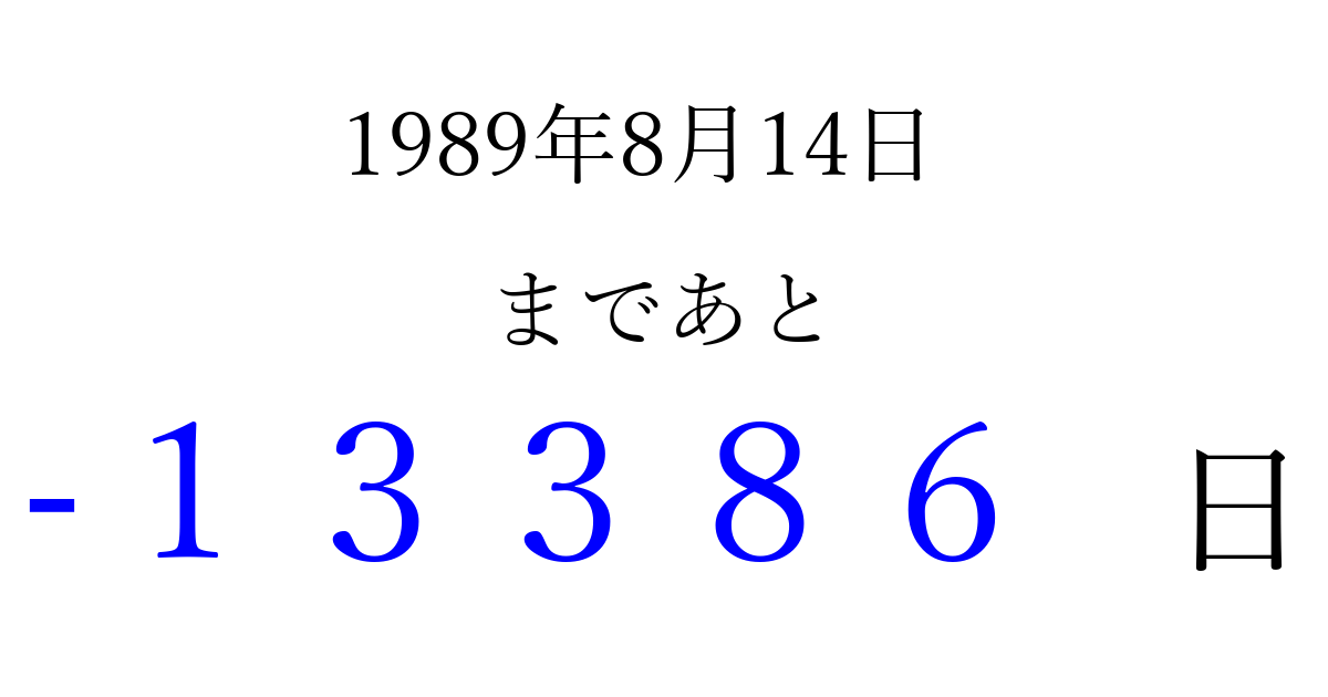 1989年8月14日(月)は もう 00000 日過ぎました 追加すると、トップページからすぐ選べるようになります ※2026/04/08現在の結果です。 最新の状態に更新する ↓シェアして、タイムライン上にカウントダウンを表示しよう!↓ 📤 この結果を共有する Tweet シェア Threads Bluesky 別の日付でカウントダウン 1989年8月のカレンダー このページをブックマークに追加すると、いつでもカウントダウンを確認できます。 (PC: Ctrl+D / Mac: ⌘+D) hitome-notes.comでは以下のページも運営しています。 指定日と期間から日付を計算 | ガチャ確率計算・シミュレーション | プライバシー・ポリシー 運営者:Avocado