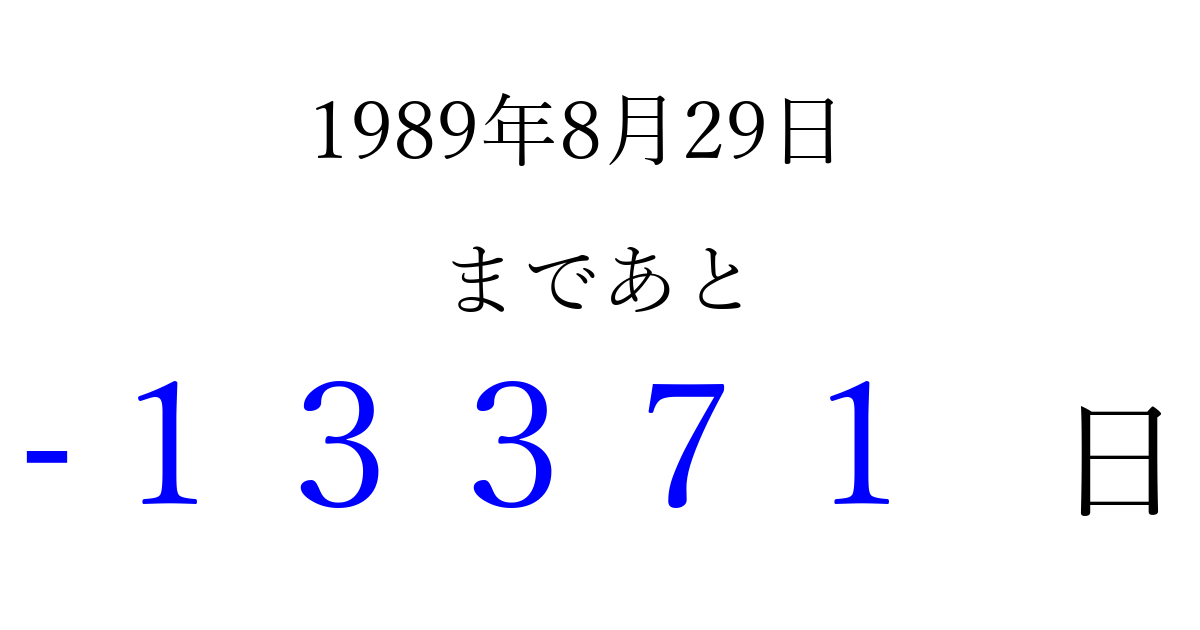 1989年8月29日(火)は もう 00000 日過ぎました 追加すると、トップページからすぐ選べるようになります ※2026/04/08現在の結果です。 最新の状態に更新する ↓シェアして、タイムライン上にカウントダウンを表示しよう!↓ 📤 この結果を共有する Tweet シェア Threads Bluesky 別の日付でカウントダウン 1989年8月のカレンダー このページをブックマークに追加すると、いつでもカウントダウンを確認できます。 (PC: Ctrl+D / Mac: ⌘+D) hitome-notes.comでは以下のページも運営しています。 指定日と期間から日付を計算 | ガチャ確率計算・シミュレーション | プライバシー・ポリシー 運営者:Avocado