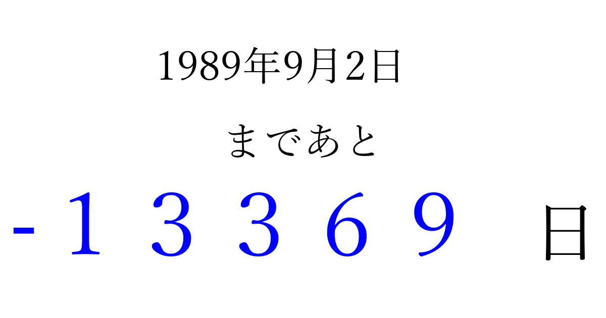1989年9月2日(土)は もう 00000 日過ぎました 追加すると、トップページからすぐ選べるようになります ※2026/04/10現在の結果です。 最新の状態に更新する ↓シェアして、タイムライン上にカウントダウンを表示しよう!↓ 📤 この結果を共有する Tweet シェア Threads Bluesky 別の日付でカウントダウン 1989年9月のカレンダー このページをブックマークに追加すると、いつでもカウントダウンを確認できます。 (PC: Ctrl+D / Mac: ⌘+D) hitome-notes.comでは以下のページも運営しています。 指定日と期間から日付を計算 | ガチャ確率計算・シミュレーション | プライバシー・ポリシー 運営者:Avocado