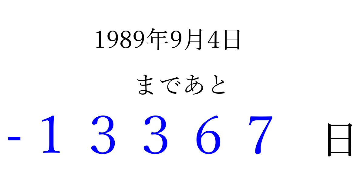 1989年9月4日(月)は もう 00000 日過ぎました 追加すると、トップページからすぐ選べるようになります ※2026/04/10現在の結果です。 最新の状態に更新する ↓シェアして、タイムライン上にカウントダウンを表示しよう!↓ 📤 この結果を共有する Tweet シェア Threads Bluesky 別の日付でカウントダウン 1989年9月のカレンダー このページをブックマークに追加すると、いつでもカウントダウンを確認できます。 (PC: Ctrl+D / Mac: ⌘+D) hitome-notes.comでは以下のページも運営しています。 指定日と期間から日付を計算 | ガチャ確率計算・シミュレーション | プライバシー・ポリシー 運営者:Avocado