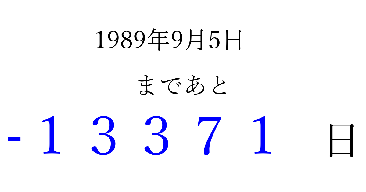 1989年9月5日(火)は もう 00000 日過ぎました 追加すると、トップページからすぐ選べるようになります ※2026/04/15現在の結果です。 最新の状態に更新する ↓シェアして、タイムライン上にカウントダウンを表示しよう!↓ 📤 この結果を共有する Tweet シェア Threads Bluesky 別の日付でカウントダウン 1989年9月のカレンダー このページをブックマークに追加すると、いつでもカウントダウンを確認できます。 (PC: Ctrl+D / Mac: ⌘+D) hitome-notes.comでは以下のページも運営しています。 指定日と期間から日付を計算 | ガチャ確率計算・シミュレーション | プライバシー・ポリシー 運営者:Avocado