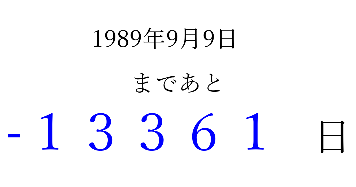 1989年9月9日(土)は もう 00000 日過ぎました 追加すると、トップページからすぐ選べるようになります ※2026/04/09現在の結果です。 最新の状態に更新する ↓シェアして、タイムライン上にカウントダウンを表示しよう!↓ 📤 この結果を共有する Tweet シェア Threads Bluesky 別の日付でカウントダウン 1989年9月のカレンダー このページをブックマークに追加すると、いつでもカウントダウンを確認できます。 (PC: Ctrl+D / Mac: ⌘+D) hitome-notes.comでは以下のページも運営しています。 指定日と期間から日付を計算 | ガチャ確率計算・シミュレーション | プライバシー・ポリシー 運営者:Avocado