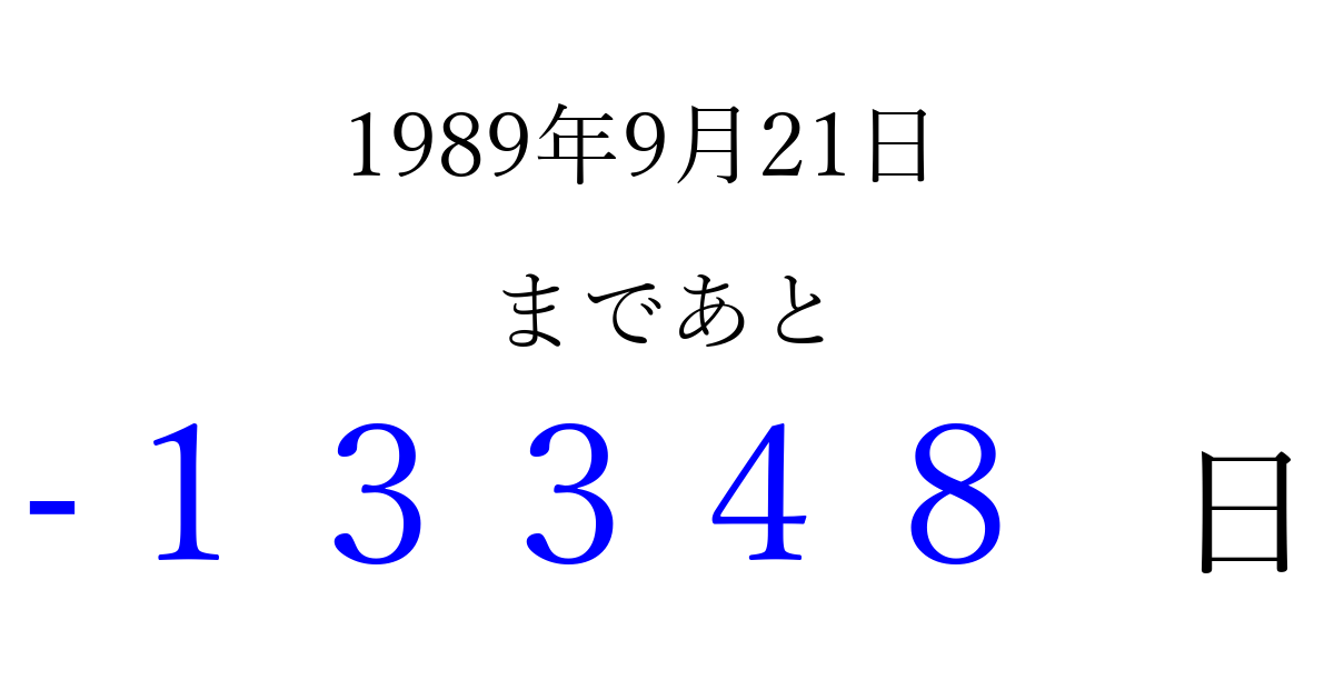 1989年9月21日(木)は もう 00000 日過ぎました 追加すると、トップページからすぐ選べるようになります ※2026/04/08現在の結果です。 最新の状態に更新する ↓シェアして、タイムライン上にカウントダウンを表示しよう!↓ 📤 この結果を共有する Tweet シェア Threads Bluesky 別の日付でカウントダウン 1989年9月のカレンダー このページをブックマークに追加すると、いつでもカウントダウンを確認できます。 (PC: Ctrl+D / Mac: ⌘+D) hitome-notes.comでは以下のページも運営しています。 指定日と期間から日付を計算 | ガチャ確率計算・シミュレーション | プライバシー・ポリシー 運営者:Avocado