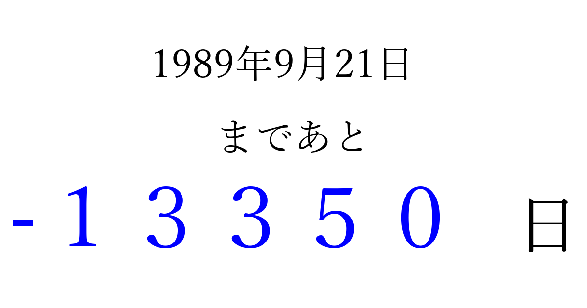 1989年9月21日(木)は もう 00000 日過ぎました 追加すると、トップページからすぐ選べるようになります ※2026/04/10現在の結果です。 最新の状態に更新する ↓シェアして、タイムライン上にカウントダウンを表示しよう!↓ 📤 この結果を共有する Tweet シェア Threads Bluesky 別の日付でカウントダウン 1989年9月のカレンダー このページをブックマークに追加すると、いつでもカウントダウンを確認できます。 (PC: Ctrl+D / Mac: ⌘+D) hitome-notes.comでは以下のページも運営しています。 指定日と期間から日付を計算 | ガチャ確率計算・シミュレーション | プライバシー・ポリシー 運営者:Avocado
