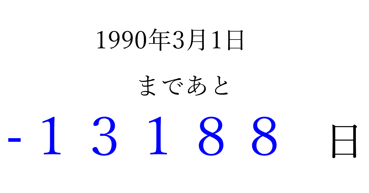 1990年3月1日(木)は もう 00000 日過ぎました 追加すると、トップページからすぐ選べるようになります ※2026/04/09現在の結果です。 最新の状態に更新する ↓シェアして、タイムライン上にカウントダウンを表示しよう!↓ 📤 この結果を共有する Tweet シェア Threads Bluesky 別の日付でカウントダウン 1990年3月のカレンダー このページをブックマークに追加すると、いつでもカウントダウンを確認できます。 (PC: Ctrl+D / Mac: ⌘+D) hitome-notes.comでは以下のページも運営しています。 指定日と期間から日付を計算 | ガチャ確率計算・シミュレーション | プライバシー・ポリシー 運営者:Avocado