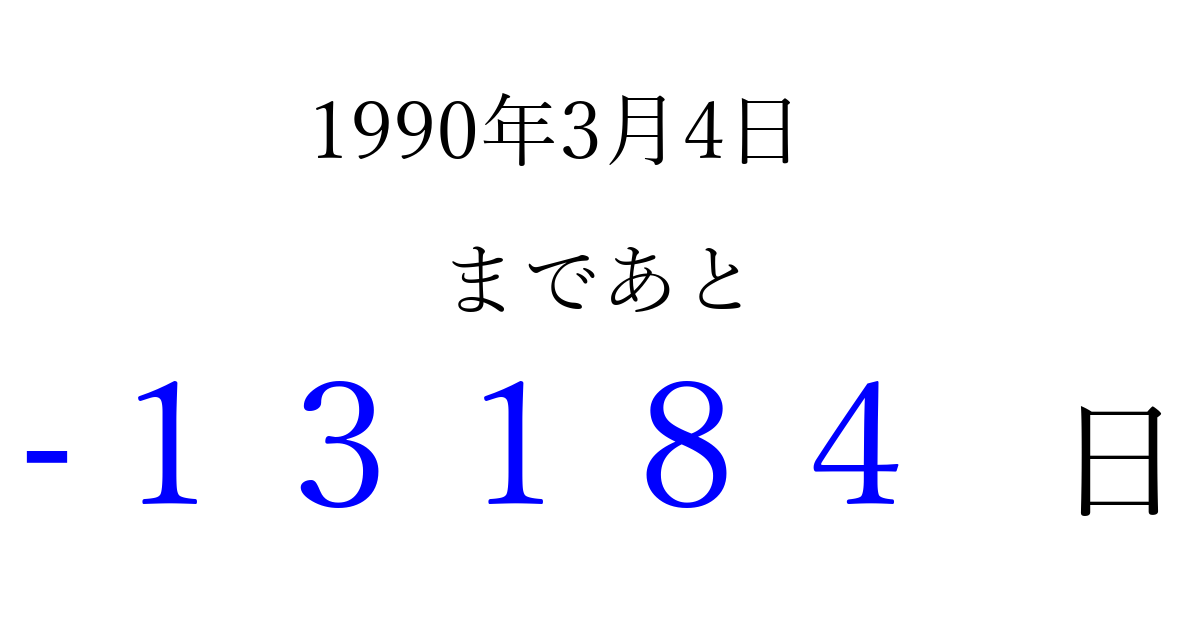 1990年3月4日(日)は もう 00000 日過ぎました 追加すると、トップページからすぐ選べるようになります ※2026/04/08現在の結果です。 最新の状態に更新する ↓シェアして、タイムライン上にカウントダウンを表示しよう!↓ 📤 この結果を共有する Tweet シェア Threads Bluesky 別の日付でカウントダウン 1990年3月のカレンダー このページをブックマークに追加すると、いつでもカウントダウンを確認できます。 (PC: Ctrl+D / Mac: ⌘+D) hitome-notes.comでは以下のページも運営しています。 指定日と期間から日付を計算 | ガチャ確率計算・シミュレーション | プライバシー・ポリシー 運営者:Avocado