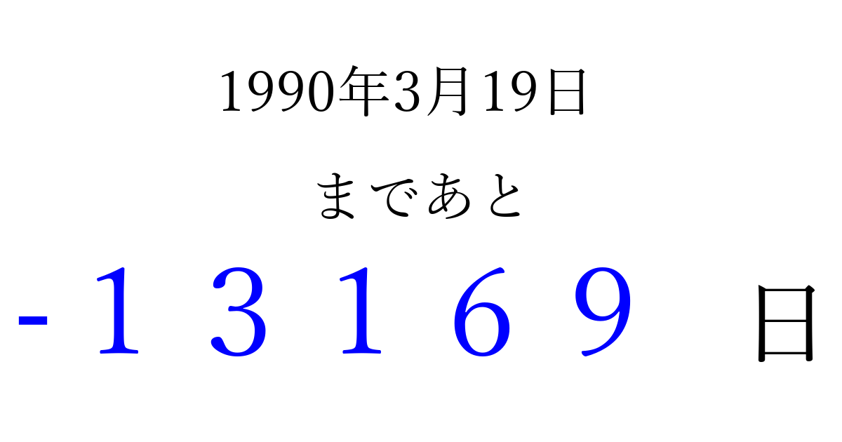 1990年3月19日(月)は もう 00000 日過ぎました 追加すると、トップページからすぐ選べるようになります ※2026/04/08現在の結果です。 最新の状態に更新する ↓シェアして、タイムライン上にカウントダウンを表示しよう!↓ 📤 この結果を共有する Tweet シェア Threads Bluesky 別の日付でカウントダウン 1990年3月のカレンダー このページをブックマークに追加すると、いつでもカウントダウンを確認できます。 (PC: Ctrl+D / Mac: ⌘+D) hitome-notes.comでは以下のページも運営しています。 指定日と期間から日付を計算 | ガチャ確率計算・シミュレーション | プライバシー・ポリシー 運営者:Avocado