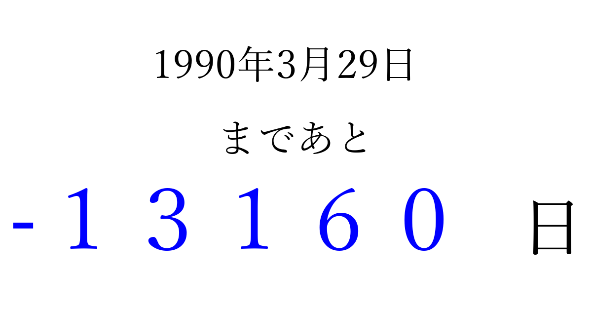 1990年3月29日(木)は もう 00000 日過ぎました 追加すると、トップページからすぐ選べるようになります ※2026/04/09現在の結果です。 最新の状態に更新する ↓シェアして、タイムライン上にカウントダウンを表示しよう!↓ 📤 この結果を共有する Tweet シェア Threads Bluesky 別の日付でカウントダウン 1990年3月のカレンダー このページをブックマークに追加すると、いつでもカウントダウンを確認できます。 (PC: Ctrl+D / Mac: ⌘+D) hitome-notes.comでは以下のページも運営しています。 指定日と期間から日付を計算 | ガチャ確率計算・シミュレーション | プライバシー・ポリシー 運営者:Avocado
