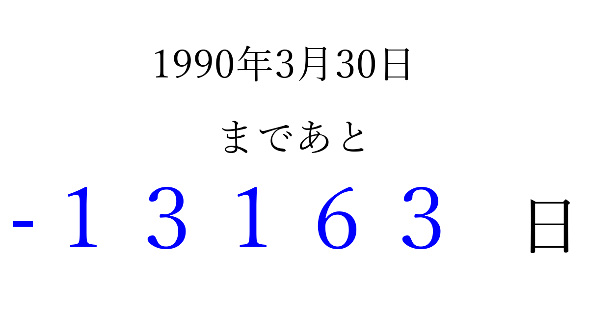 1990年3月30日(金)は もう 00000 日過ぎました 追加すると、トップページからすぐ選べるようになります ※2026/04/13現在の結果です。 最新の状態に更新する ↓シェアして、タイムライン上にカウントダウンを表示しよう!↓ 📤 この結果を共有する Tweet シェア Threads Bluesky 別の日付でカウントダウン 1990年3月のカレンダー このページをブックマークに追加すると、いつでもカウントダウンを確認できます。 (PC: Ctrl+D / Mac: ⌘+D) hitome-notes.comでは以下のページも運営しています。 指定日と期間から日付を計算 | ガチャ確率計算・シミュレーション | プライバシー・ポリシー 運営者:Avocado