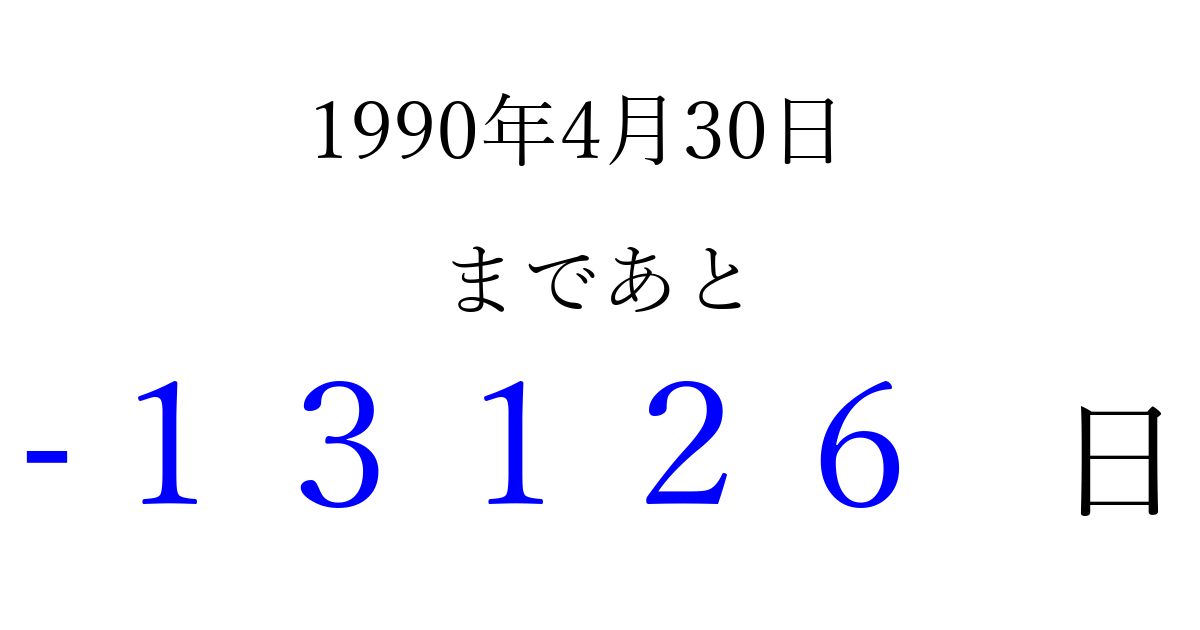 1990年4月30日(月)は もう 00000 日過ぎました 追加すると、トップページからすぐ選べるようになります ※2026/04/07現在の結果です。 最新の状態に更新する ↓シェアして、タイムライン上にカウントダウンを表示しよう!↓ 📤 この結果を共有する Tweet シェア Threads Bluesky 別の日付でカウントダウン 1990年4月のカレンダー このページをブックマークに追加すると、いつでもカウントダウンを確認できます。 (PC: Ctrl+D / Mac: ⌘+D) hitome-notes.comでは以下のページも運営しています。 指定日と期間から日付を計算 | ガチャ確率計算・シミュレーション | プライバシー・ポリシー 運営者:Avocado