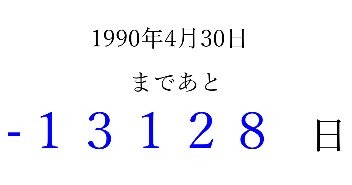 1990年4月30日(月)は もう 00000 日過ぎました 追加すると、トップページからすぐ選べるようになります ※2026/04/09現在の結果です。 最新の状態に更新する ↓シェアして、タイムライン上にカウントダウンを表示しよう!↓ 📤 この結果を共有する Tweet シェア Threads Bluesky 別の日付でカウントダウン 1990年4月のカレンダー このページをブックマークに追加すると、いつでもカウントダウンを確認できます。 (PC: Ctrl+D / Mac: ⌘+D) hitome-notes.comでは以下のページも運営しています。 指定日と期間から日付を計算 | ガチャ確率計算・シミュレーション | プライバシー・ポリシー 運営者:Avocado
