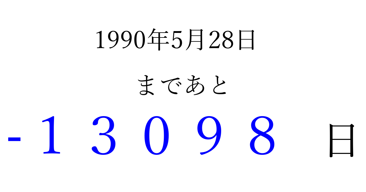 1990年5月28日(月)は もう 00000 日過ぎました 追加すると、トップページからすぐ選べるようになります ※2026/04/07現在の結果です。 最新の状態に更新する ↓シェアして、タイムライン上にカウントダウンを表示しよう!↓ 📤 この結果を共有する Tweet シェア Threads Bluesky 別の日付でカウントダウン 1990年5月のカレンダー このページをブックマークに追加すると、いつでもカウントダウンを確認できます。 (PC: Ctrl+D / Mac: ⌘+D) hitome-notes.comでは以下のページも運営しています。 指定日と期間から日付を計算 | ガチャ確率計算・シミュレーション | プライバシー・ポリシー 運営者:Avocado