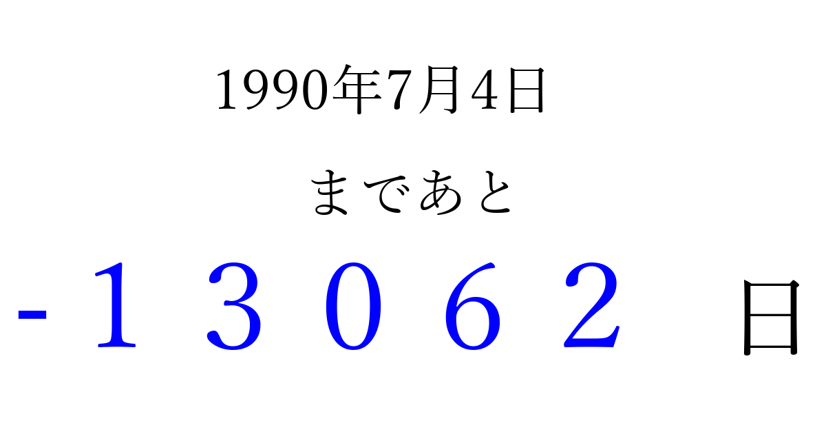 1990年7月4日(水)は もう 00000 日過ぎました 追加すると、トップページからすぐ選べるようになります ※2026/04/08現在の結果です。 最新の状態に更新する ↓シェアして、タイムライン上にカウントダウンを表示しよう!↓ 📤 この結果を共有する Tweet シェア Threads Bluesky 別の日付でカウントダウン 1990年7月のカレンダー このページをブックマークに追加すると、いつでもカウントダウンを確認できます。 (PC: Ctrl+D / Mac: ⌘+D) hitome-notes.comでは以下のページも運営しています。 指定日と期間から日付を計算 | ガチャ確率計算・シミュレーション | プライバシー・ポリシー 運営者:Avocado