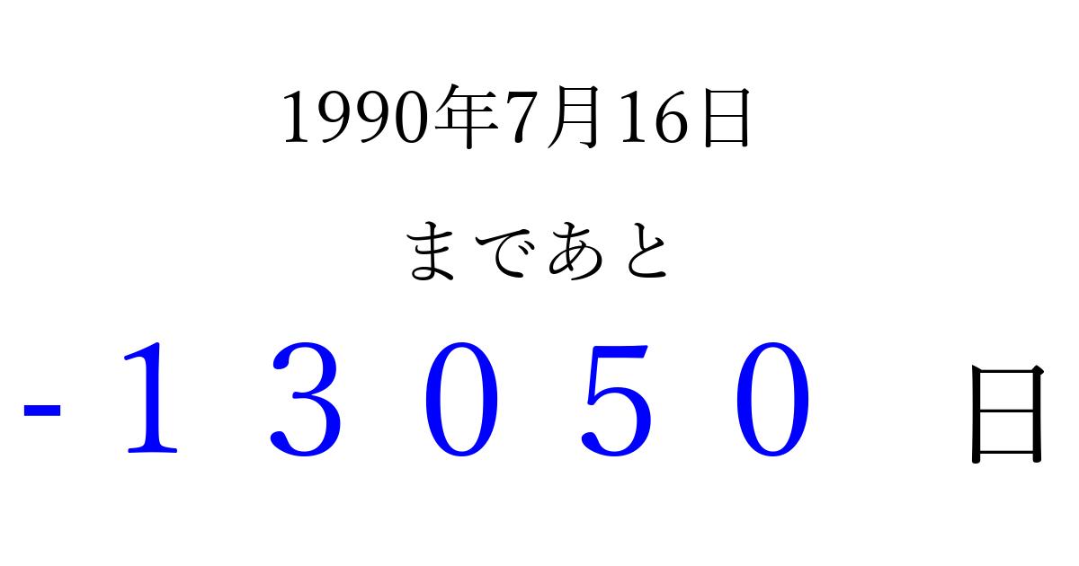 1990年7月16日(月)は もう 00000 日過ぎました 追加すると、トップページからすぐ選べるようになります ※2026/04/08現在の結果です。 最新の状態に更新する ↓シェアして、タイムライン上にカウントダウンを表示しよう!↓ 📤 この結果を共有する Tweet シェア Threads Bluesky 別の日付でカウントダウン 1990年7月のカレンダー このページをブックマークに追加すると、いつでもカウントダウンを確認できます。 (PC: Ctrl+D / Mac: ⌘+D) hitome-notes.comでは以下のページも運営しています。 指定日と期間から日付を計算 | ガチャ確率計算・シミュレーション | プライバシー・ポリシー 運営者:Avocado