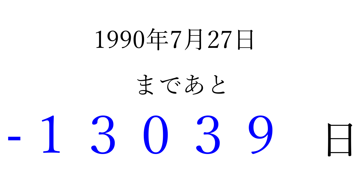 1990年7月27日(金)は もう 00000 日過ぎました 追加すると、トップページからすぐ選べるようになります ※2026/04/08現在の結果です。 最新の状態に更新する ↓シェアして、タイムライン上にカウントダウンを表示しよう!↓ 📤 この結果を共有する Tweet シェア Threads Bluesky 別の日付でカウントダウン 1990年7月のカレンダー このページをブックマークに追加すると、いつでもカウントダウンを確認できます。 (PC: Ctrl+D / Mac: ⌘+D) hitome-notes.comでは以下のページも運営しています。 指定日と期間から日付を計算 | ガチャ確率計算・シミュレーション | プライバシー・ポリシー 運営者:Avocado