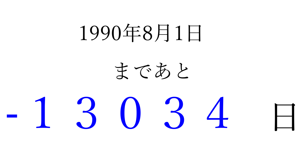 1990年8月1日(水)は もう 00000 日過ぎました 追加すると、トップページからすぐ選べるようになります ※2026/04/08現在の結果です。 最新の状態に更新する ↓シェアして、タイムライン上にカウントダウンを表示しよう!↓ 📤 この結果を共有する Tweet シェア Threads Bluesky 別の日付でカウントダウン 1990年8月のカレンダー このページをブックマークに追加すると、いつでもカウントダウンを確認できます。 (PC: Ctrl+D / Mac: ⌘+D) hitome-notes.comでは以下のページも運営しています。 指定日と期間から日付を計算 | ガチャ確率計算・シミュレーション | プライバシー・ポリシー 運営者:Avocado
