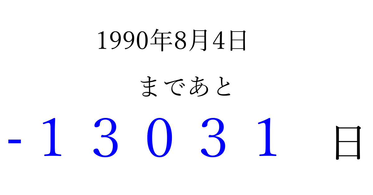 1990年8月4日(土)は もう 00000 日過ぎました 追加すると、トップページからすぐ選べるようになります ※2026/04/08現在の結果です。 最新の状態に更新する ↓シェアして、タイムライン上にカウントダウンを表示しよう!↓ 📤 この結果を共有する Tweet シェア Threads Bluesky 別の日付でカウントダウン 1990年8月のカレンダー このページをブックマークに追加すると、いつでもカウントダウンを確認できます。 (PC: Ctrl+D / Mac: ⌘+D) hitome-notes.comでは以下のページも運営しています。 指定日と期間から日付を計算 | ガチャ確率計算・シミュレーション | プライバシー・ポリシー 運営者:Avocado
