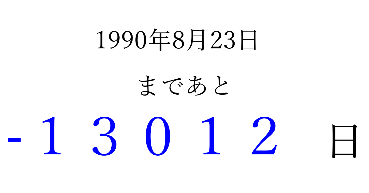 1990年8月23日(木)は もう 00000 日過ぎました 追加すると、トップページからすぐ選べるようになります ※2026/04/08現在の結果です。 最新の状態に更新する ↓シェアして、タイムライン上にカウントダウンを表示しよう!↓ 📤 この結果を共有する Tweet シェア Threads Bluesky 別の日付でカウントダウン 1990年8月のカレンダー このページをブックマークに追加すると、いつでもカウントダウンを確認できます。 (PC: Ctrl+D / Mac: ⌘+D) hitome-notes.comでは以下のページも運営しています。 指定日と期間から日付を計算 | ガチャ確率計算・シミュレーション | プライバシー・ポリシー 運営者:Avocado