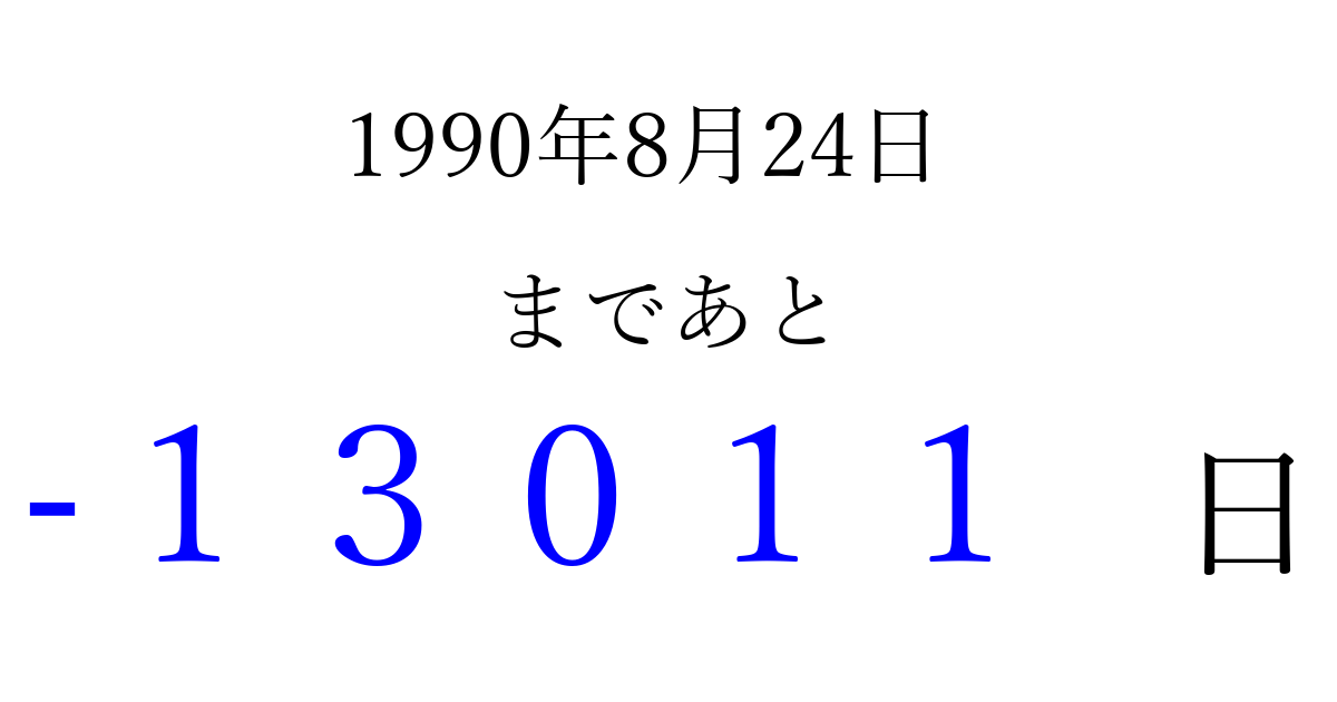 1990年8月24日(金)は もう 00000 日過ぎました 追加すると、トップページからすぐ選べるようになります ※2026/04/08現在の結果です。 最新の状態に更新する ↓シェアして、タイムライン上にカウントダウンを表示しよう!↓ 📤 この結果を共有する Tweet シェア Threads Bluesky 別の日付でカウントダウン 1990年8月のカレンダー このページをブックマークに追加すると、いつでもカウントダウンを確認できます。 (PC: Ctrl+D / Mac: ⌘+D) hitome-notes.comでは以下のページも運営しています。 指定日と期間から日付を計算 | ガチャ確率計算・シミュレーション | プライバシー・ポリシー 運営者:Avocado