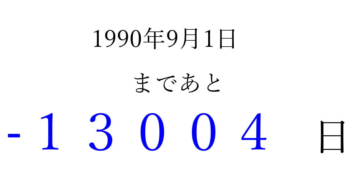 1990年9月1日(土)は もう 00000 日過ぎました 追加すると、トップページからすぐ選べるようになります ※2026/04/09現在の結果です。 最新の状態に更新する ↓シェアして、タイムライン上にカウントダウンを表示しよう!↓ 📤 この結果を共有する Tweet シェア Threads Bluesky 別の日付でカウントダウン 1990年9月のカレンダー このページをブックマークに追加すると、いつでもカウントダウンを確認できます。 (PC: Ctrl+D / Mac: ⌘+D) hitome-notes.comでは以下のページも運営しています。 指定日と期間から日付を計算 | ガチャ確率計算・シミュレーション | プライバシー・ポリシー 運営者:Avocado