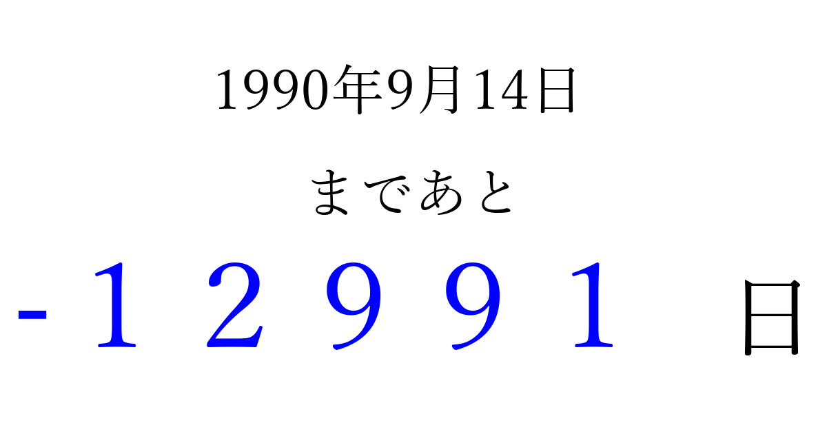 1990年9月14日(金)は もう 00000 日過ぎました 追加すると、トップページからすぐ選べるようになります ※2026/04/09現在の結果です。 最新の状態に更新する ↓シェアして、タイムライン上にカウントダウンを表示しよう!↓ 📤 この結果を共有する Tweet シェア Threads Bluesky 別の日付でカウントダウン 1990年9月のカレンダー このページをブックマークに追加すると、いつでもカウントダウンを確認できます。 (PC: Ctrl+D / Mac: ⌘+D) hitome-notes.comでは以下のページも運営しています。 指定日と期間から日付を計算 | ガチャ確率計算・シミュレーション | プライバシー・ポリシー 運営者:Avocado