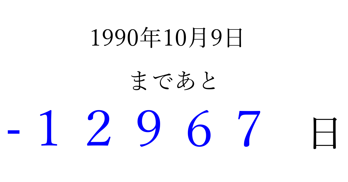 1990年10月9日(火)は もう 00000 日過ぎました 追加すると、トップページからすぐ選べるようになります ※2026/04/10現在の結果です。 最新の状態に更新する ↓シェアして、タイムライン上にカウントダウンを表示しよう!↓ 📤 この結果を共有する Tweet シェア Threads Bluesky 別の日付でカウントダウン 1990年10月のカレンダー このページをブックマークに追加すると、いつでもカウントダウンを確認できます。 (PC: Ctrl+D / Mac: ⌘+D) hitome-notes.comでは以下のページも運営しています。 指定日と期間から日付を計算 | ガチャ確率計算・シミュレーション | プライバシー・ポリシー 運営者:Avocado