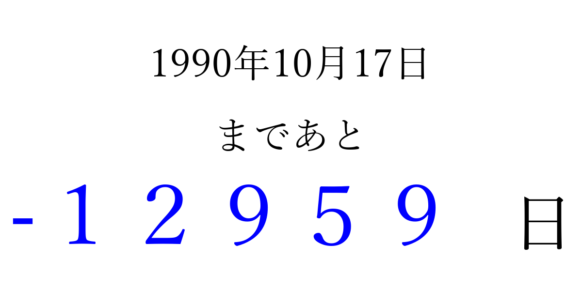 1990年10月17日(水)は もう 00000 日過ぎました 追加すると、トップページからすぐ選べるようになります ※2026/04/10現在の結果です。 最新の状態に更新する ↓シェアして、タイムライン上にカウントダウンを表示しよう!↓ 📤 この結果を共有する Tweet シェア Threads Bluesky 別の日付でカウントダウン 1990年10月のカレンダー このページをブックマークに追加すると、いつでもカウントダウンを確認できます。 (PC: Ctrl+D / Mac: ⌘+D) hitome-notes.comでは以下のページも運営しています。 指定日と期間から日付を計算 | ガチャ確率計算・シミュレーション | プライバシー・ポリシー 運営者:Avocado