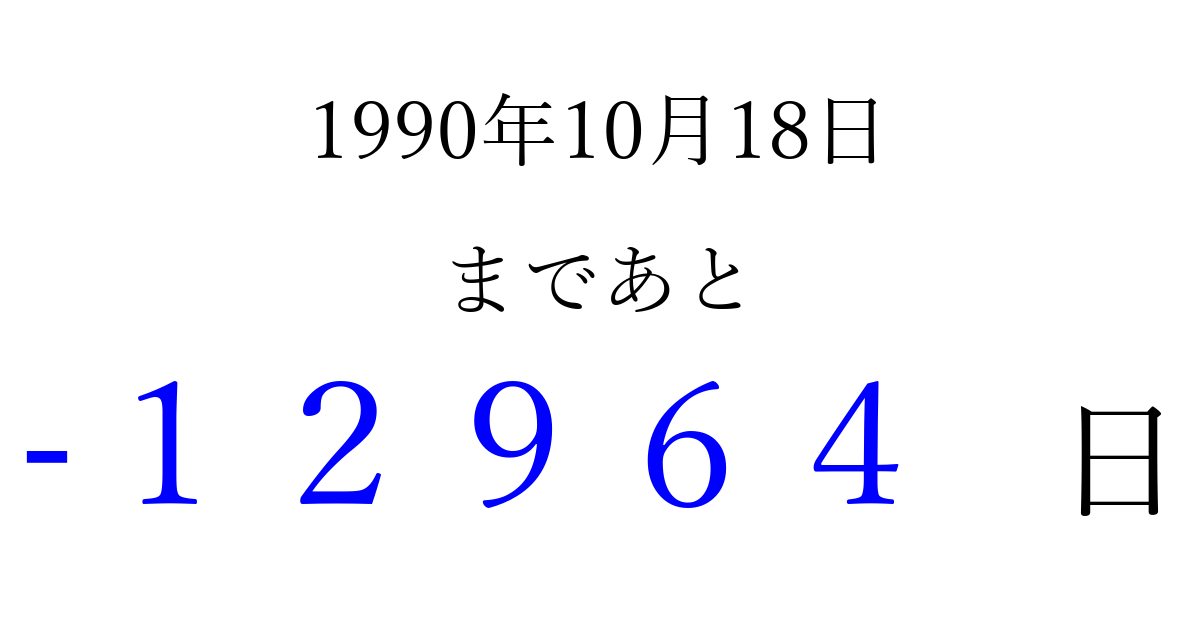 1990年10月18日(木)は もう 00000 日過ぎました 追加すると、トップページからすぐ選べるようになります ※2026/04/16現在の結果です。 最新の状態に更新する ↓シェアして、タイムライン上にカウントダウンを表示しよう!↓ 📤 この結果を共有する Tweet シェア Threads Bluesky 別の日付でカウントダウン 1990年10月のカレンダー このページをブックマークに追加すると、いつでもカウントダウンを確認できます。 (PC: Ctrl+D / Mac: ⌘+D) hitome-notes.comでは以下のページも運営しています。 指定日と期間から日付を計算 | ガチャ確率計算・シミュレーション | プライバシー・ポリシー 運営者:Avocado