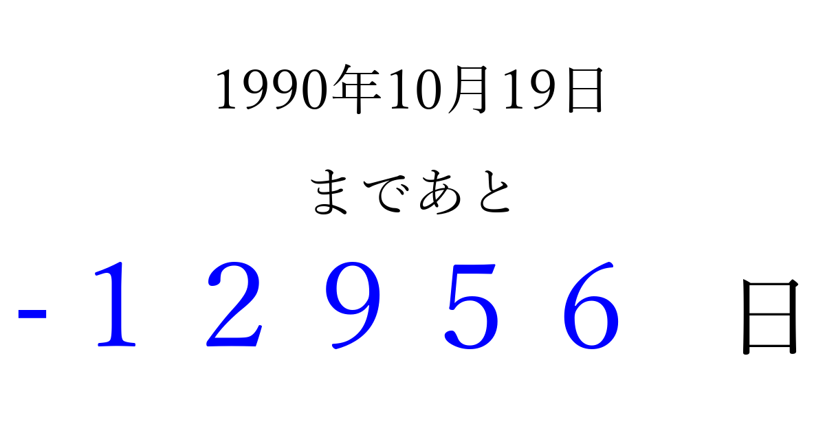 1990年10月19日(金)は もう 00000 日過ぎました 追加すると、トップページからすぐ選べるようになります ※2026/04/09現在の結果です。 最新の状態に更新する ↓シェアして、タイムライン上にカウントダウンを表示しよう!↓ 📤 この結果を共有する Tweet シェア Threads Bluesky 別の日付でカウントダウン 1990年10月のカレンダー このページをブックマークに追加すると、いつでもカウントダウンを確認できます。 (PC: Ctrl+D / Mac: ⌘+D) hitome-notes.comでは以下のページも運営しています。 指定日と期間から日付を計算 | ガチャ確率計算・シミュレーション | プライバシー・ポリシー 運営者:Avocado