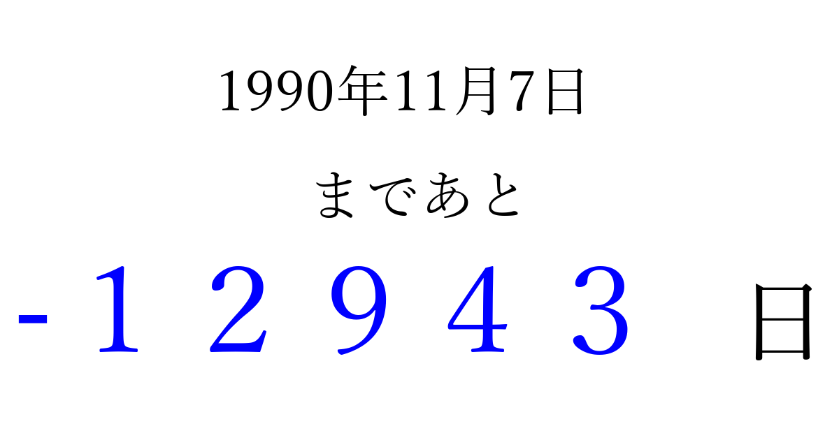 1990年11月7日(水)は もう 00000 日過ぎました 追加すると、トップページからすぐ選べるようになります ※2026/04/15現在の結果です。 最新の状態に更新する ↓シェアして、タイムライン上にカウントダウンを表示しよう!↓ 📤 この結果を共有する Tweet シェア Threads Bluesky 別の日付でカウントダウン 1990年11月のカレンダー このページをブックマークに追加すると、いつでもカウントダウンを確認できます。 (PC: Ctrl+D / Mac: ⌘+D) hitome-notes.comでは以下のページも運営しています。 指定日と期間から日付を計算 | ガチャ確率計算・シミュレーション | プライバシー・ポリシー 運営者:Avocado