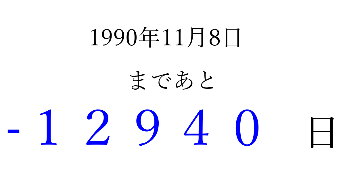 1990年11月8日(木)は もう 00000 日過ぎました 追加すると、トップページからすぐ選べるようになります ※2026/04/13現在の結果です。 最新の状態に更新する ↓シェアして、タイムライン上にカウントダウンを表示しよう!↓ 📤 この結果を共有する Tweet シェア Threads Bluesky 別の日付でカウントダウン 1990年11月のカレンダー このページをブックマークに追加すると、いつでもカウントダウンを確認できます。 (PC: Ctrl+D / Mac: ⌘+D) hitome-notes.comでは以下のページも運営しています。 指定日と期間から日付を計算 | ガチャ確率計算・シミュレーション | プライバシー・ポリシー 運営者:Avocado