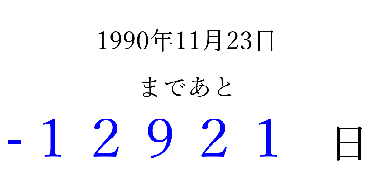 1990年11月23日(金)は もう 00000 日過ぎました 追加すると、トップページからすぐ選べるようになります ※2026/04/09現在の結果です。 最新の状態に更新する ↓シェアして、タイムライン上にカウントダウンを表示しよう!↓ 📤 この結果を共有する Tweet シェア Threads Bluesky 別の日付でカウントダウン 1990年11月のカレンダー このページをブックマークに追加すると、いつでもカウントダウンを確認できます。 (PC: Ctrl+D / Mac: ⌘+D) hitome-notes.comでは以下のページも運営しています。 指定日と期間から日付を計算 | ガチャ確率計算・シミュレーション | プライバシー・ポリシー 運営者:Avocado