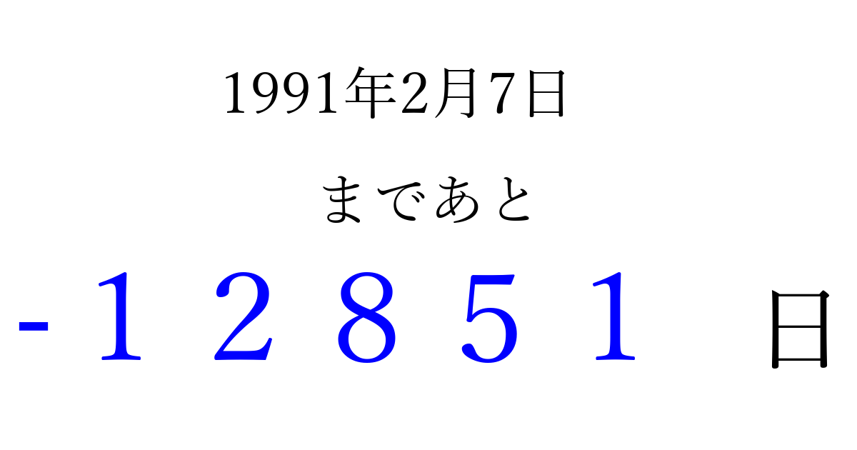 1991年2月7日(木)は もう 00000 日過ぎました 追加すると、トップページからすぐ選べるようになります ※2026/04/15現在の結果です。 最新の状態に更新する ↓シェアして、タイムライン上にカウントダウンを表示しよう!↓ 📤 この結果を共有する Tweet シェア Threads Bluesky 別の日付でカウントダウン 1991年2月のカレンダー このページをブックマークに追加すると、いつでもカウントダウンを確認できます。 (PC: Ctrl+D / Mac: ⌘+D) hitome-notes.comでは以下のページも運営しています。 指定日と期間から日付を計算 | ガチャ確率計算・シミュレーション | プライバシー・ポリシー 運営者:Avocado