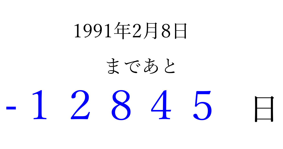 1991年2月8日(金)は もう 00000 日過ぎました 追加すると、トップページからすぐ選べるようになります ※2026/04/10現在の結果です。 最新の状態に更新する ↓シェアして、タイムライン上にカウントダウンを表示しよう!↓ 📤 この結果を共有する Tweet シェア Threads Bluesky 別の日付でカウントダウン 1991年2月のカレンダー このページをブックマークに追加すると、いつでもカウントダウンを確認できます。 (PC: Ctrl+D / Mac: ⌘+D) hitome-notes.comでは以下のページも運営しています。 指定日と期間から日付を計算 | ガチャ確率計算・シミュレーション | プライバシー・ポリシー 運営者:Avocado