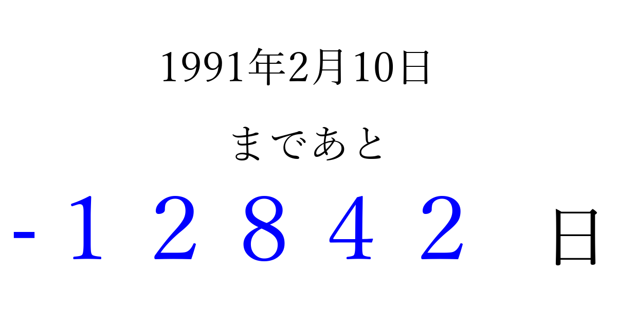 1991年2月10日(日)は もう 00000 日過ぎました 追加すると、トップページからすぐ選べるようになります ※2026/04/09現在の結果です。 最新の状態に更新する ↓シェアして、タイムライン上にカウントダウンを表示しよう!↓ 📤 この結果を共有する Tweet シェア Threads Bluesky 別の日付でカウントダウン 1991年2月のカレンダー このページをブックマークに追加すると、いつでもカウントダウンを確認できます。 (PC: Ctrl+D / Mac: ⌘+D) hitome-notes.comでは以下のページも運営しています。 指定日と期間から日付を計算 | ガチャ確率計算・シミュレーション | プライバシー・ポリシー 運営者:Avocado