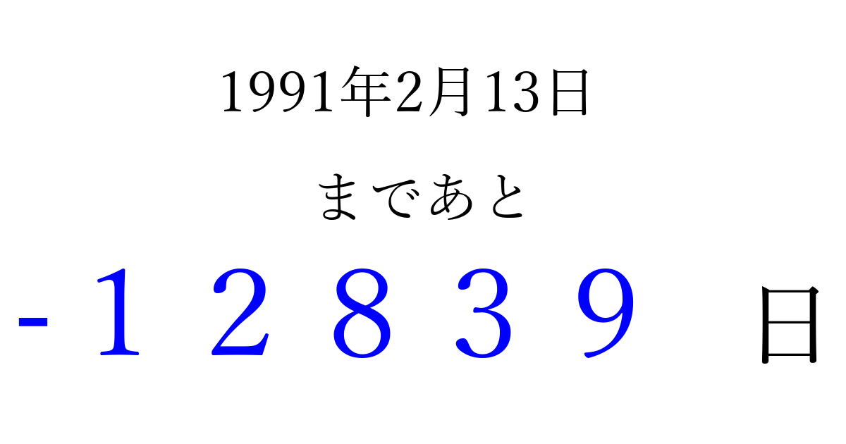 1991年2月13日(水)は もう 00000 日過ぎました 追加すると、トップページからすぐ選べるようになります ※2026/04/09現在の結果です。 最新の状態に更新する ↓シェアして、タイムライン上にカウントダウンを表示しよう!↓ 📤 この結果を共有する Tweet シェア Threads Bluesky 別の日付でカウントダウン 1991年2月のカレンダー このページをブックマークに追加すると、いつでもカウントダウンを確認できます。 (PC: Ctrl+D / Mac: ⌘+D) hitome-notes.comでは以下のページも運営しています。 指定日と期間から日付を計算 | ガチャ確率計算・シミュレーション | プライバシー・ポリシー 運営者:Avocado